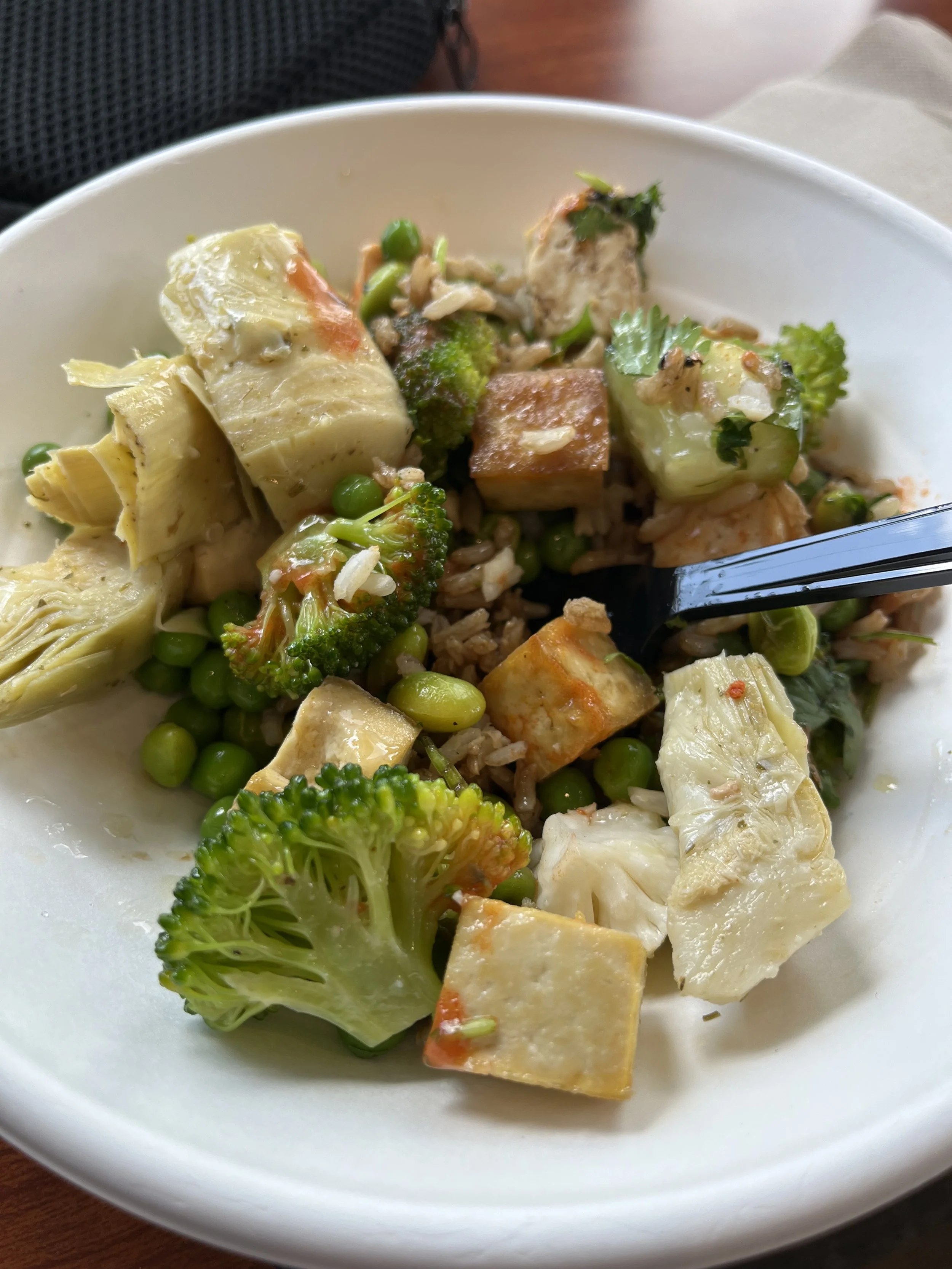 Delicious dish of mushrooms, broccoli, peas, and artichokes over nutty brown rice, drizzled with Vietnamese vinegar, red chili sauce, and sesame oil. This flavorful meal takes only 15 minutes to prepare!